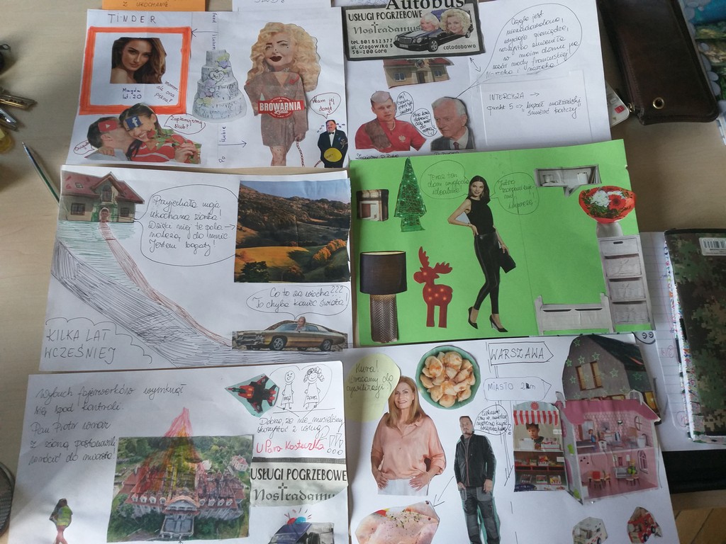 Dopiero po takim wprowadzeniu podzieliliśmy się na grupy i wyjaśniliśmy, na czym dokładnie polega nasze zadanie. Zaskoczenie uczniów wielkie. Mnóstwo pytań. Nigdy podobnego zadania nie robili. To z pewnością zaleta, bo zapamiętają aktywności, w których biorą udział. Najtrudniej było zacząć, ale z czasem pojawił się dobry humor, koncentracja na zadaniach, wspólne ustalenia i przekonywanie do swoich racji. Ustaliliśmy, że stron historyjki komiksowej będzie tyle, ile drużyn. Przeniesienie akcji w czasy współczesne sprawiły, że uczniowie zrozumieli przesłanie satyry. A oto efekty ich pracy: