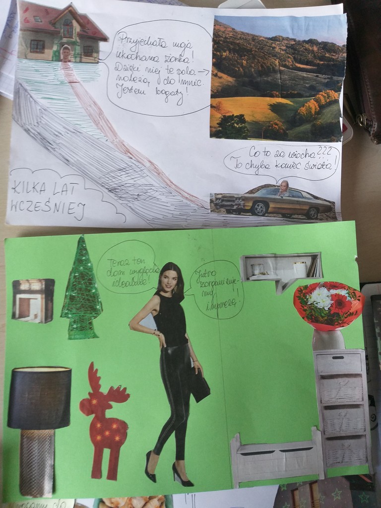 Uczniowie klasy 7B przynieśli na lekcję języka polskiego wycinki z kolorowych czasopism przedstawiające m. in. modne panie i panów, modne wyposażenia wnętrz, atrakcyjne miejsca, dekoracje, elementy ubioru oraz klej, nożyczki, kredki, pisaki. Najpierw w tekście satyry Ignacego Krasickiego pt. ,,Żona modna” wyszukiwaliśmy zacytowane wypowiedzi bohaterów i omawialiśmy, w jaki sposób zostały przytoczone, zwracając uwagę na znaki przestankowe. Przy okazji wyjaśnialiśmy kto, do kogo, w jakim celu tak powiedział.
