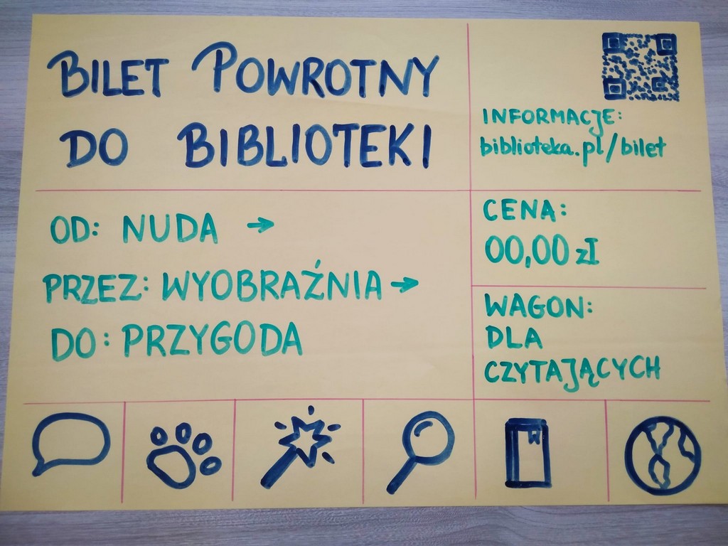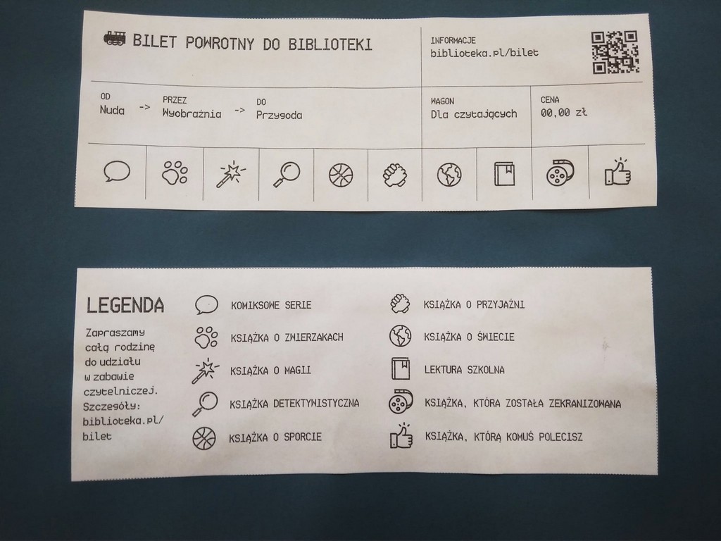Z gazetki przed biblioteką można pobrać bilet, na którym znajdują się różne ikonki. Na odwrocie zaś widnieje legenda z wyjaśnieniem, jakie kategorie książek ilustrują symbole.